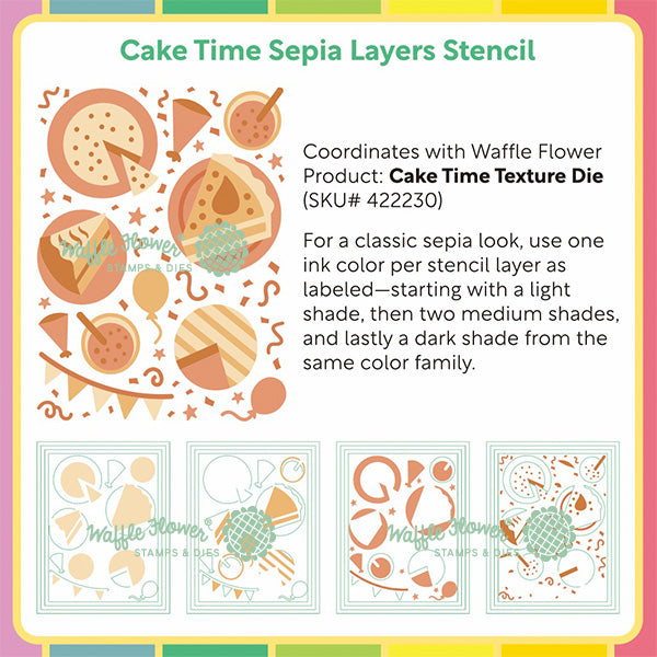 Add a vintage touch to your birthday cards with this 4-layer stencil set designed to match the Cake Time Texture Die. Each stencil is labeled to guide your inking—start with the lightest tone, layer on two medium shades, and finish with a dark tone from the same color family for that classic sepia look.