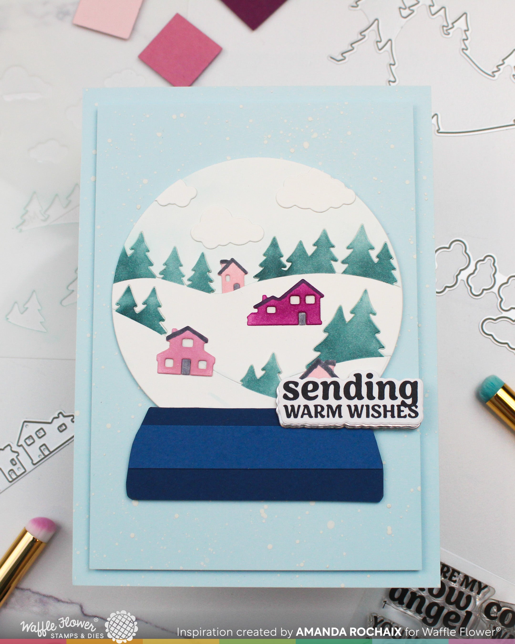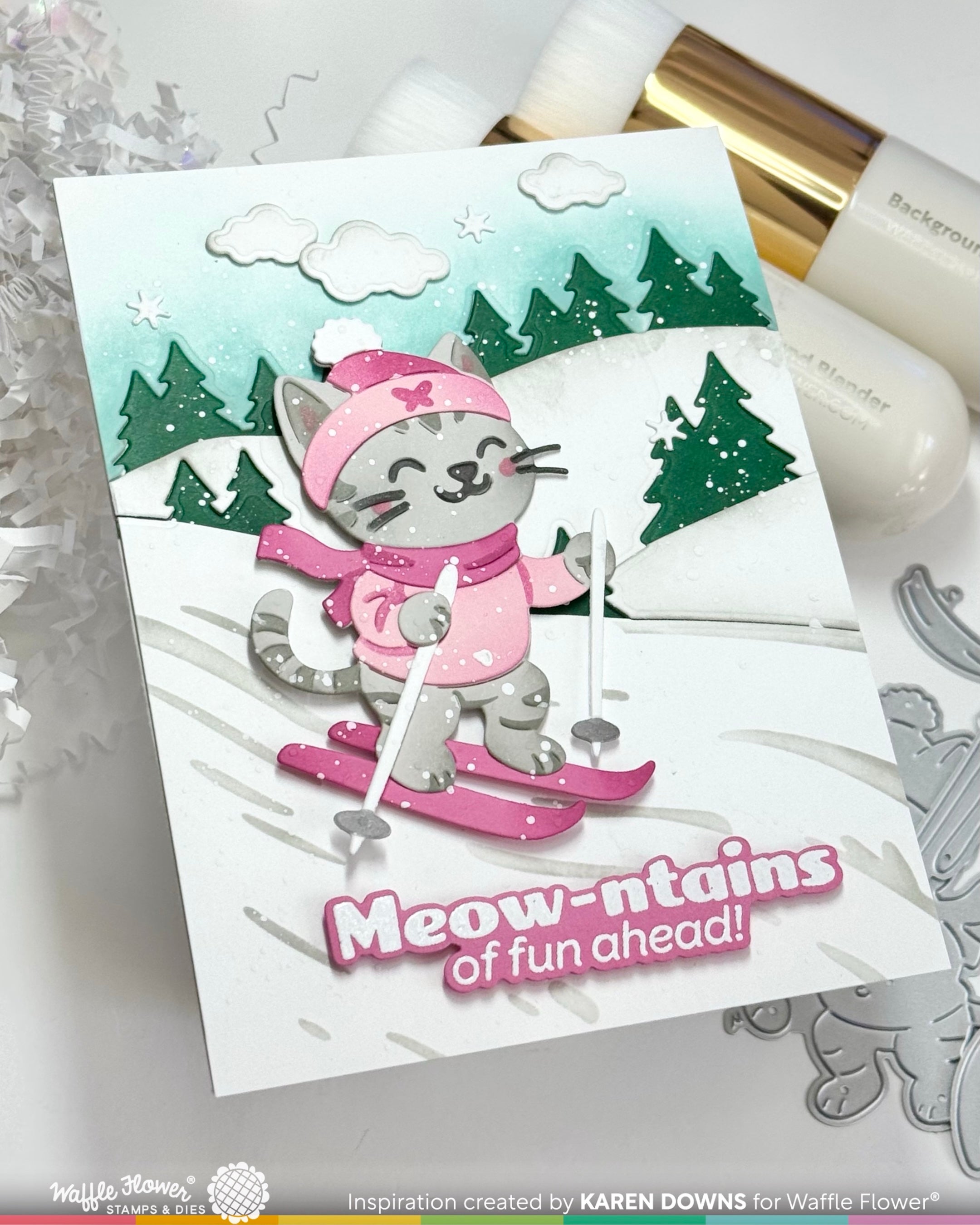 This die set cuts three wavy hill lines with trees and is slightly smaller than 4.25” wide to fit an A2 panel. Use it with the Snowy Hills Stencil to add color, keep the pieces together for a full background, trim them apart to create your own scene, or pair with the Add-on Die for more options.