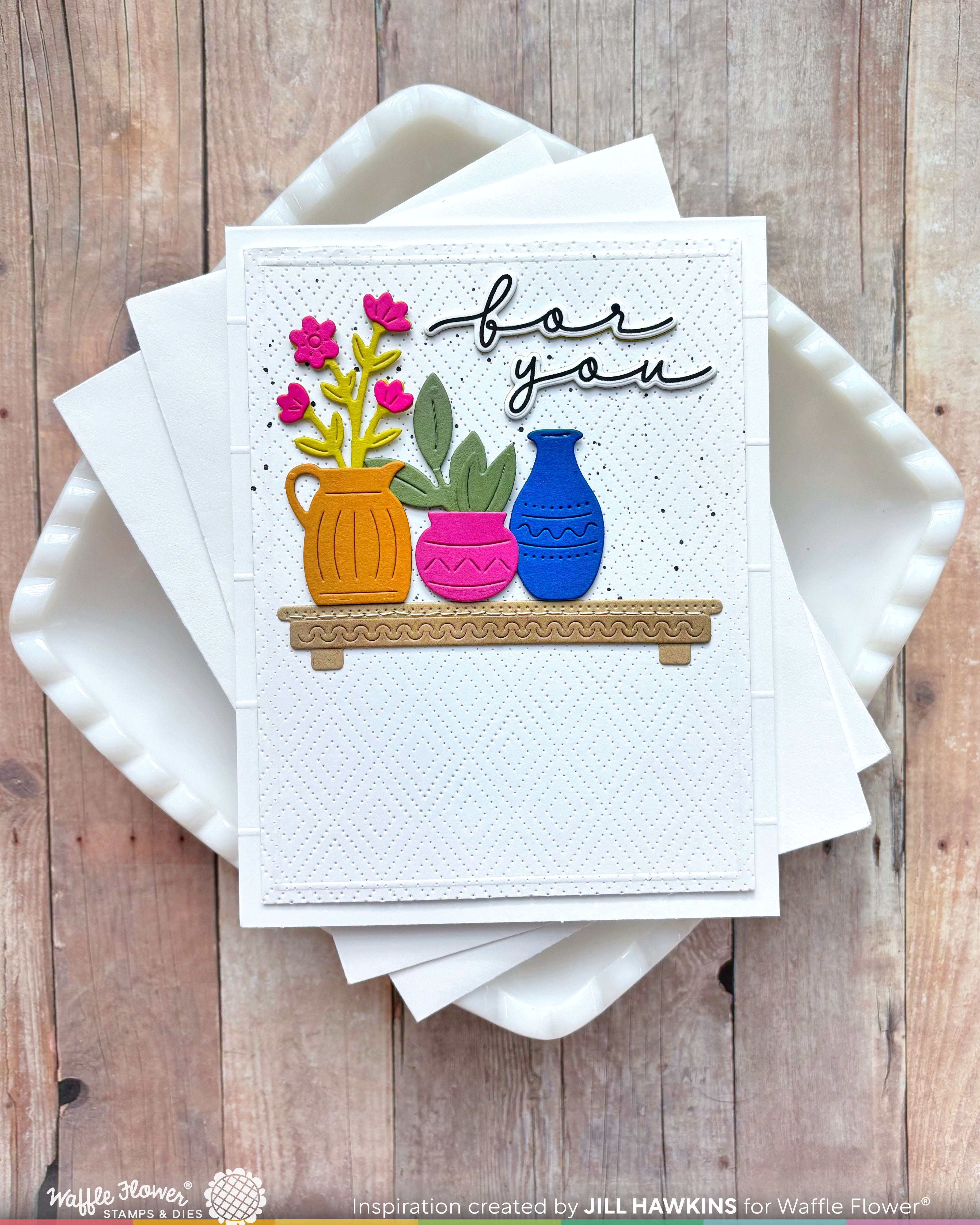 Create a charming shelf scene with this die set featuring three different containers, a variety of mix-and-match floral and leaf elements, and a decorative shelf base. Great for building mini arrangements or adding a homey touch to your card. The pieces are easy to layer and customize with different cardstock colors or ink.