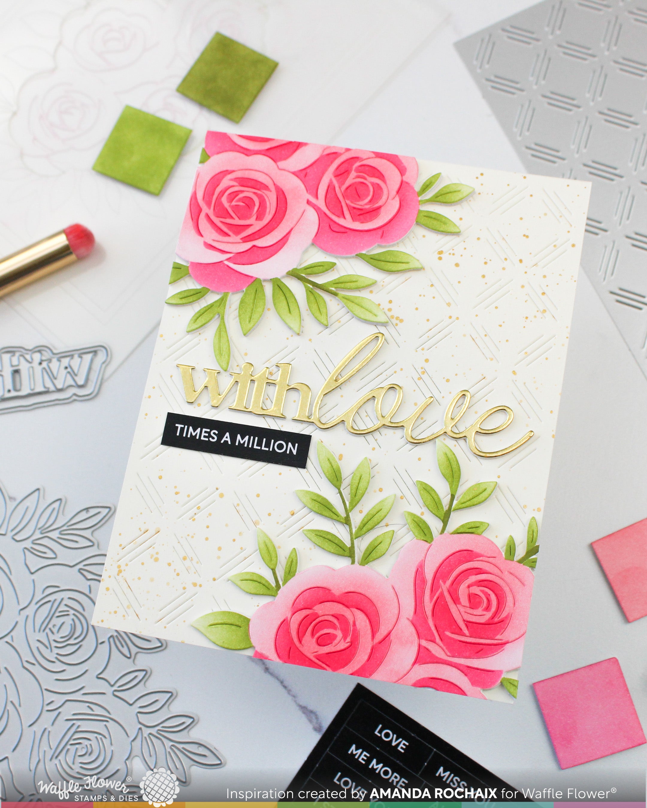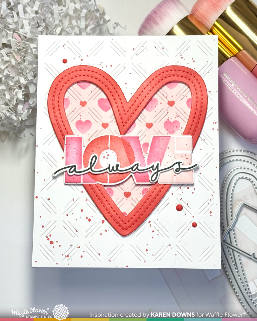This die cuts a stitched lattice pattern with no outer border, making it easy to layer. Use it on its own or pair it with the coordinating stencils for extra detail and color.