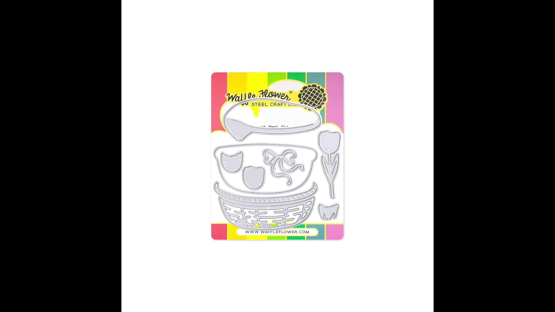 The Basketful Base Die features a woven basket, a soft liner, a bow, and a layered tulip. The tulip heads come in three layers to build dimension. Tuck the tulips into the basket or pair with the Basketful Add-ons for even more fun!