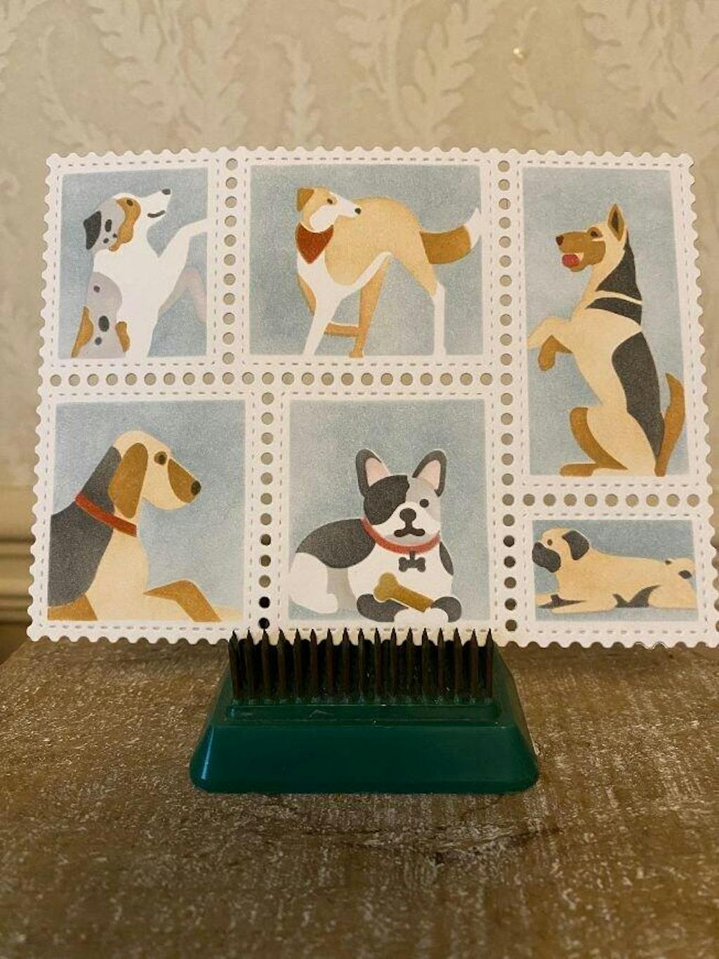 Bring some tail-wagging fun to your next project with the Postage Collage Woof Stencil! This stencil features a variety of adorable pups in different poses and breeds, perfect for dog lovers. It’s designed to coordinate with the Postage Collage Die (421382) and Postage Collage Blocks Die (421830). Use it over a die-cut panel or a standard A2-sized white cardstock. The white areas shown in the examples represent the base color of the cardstock.