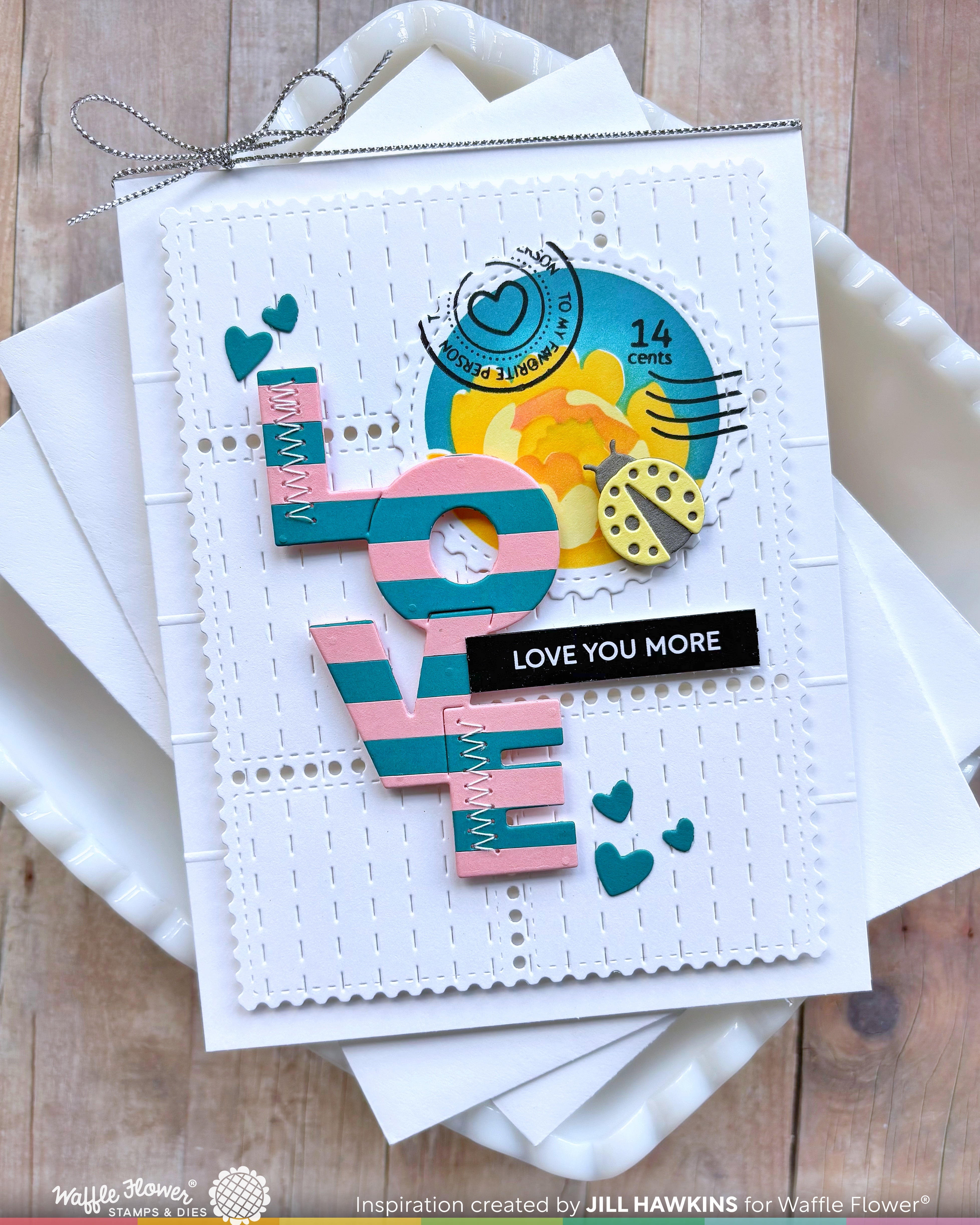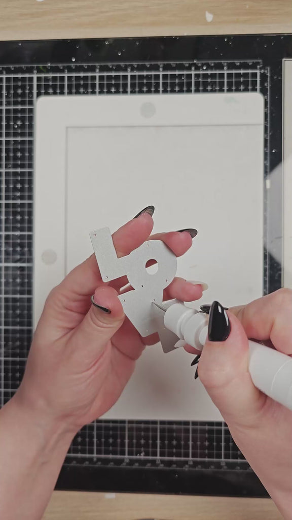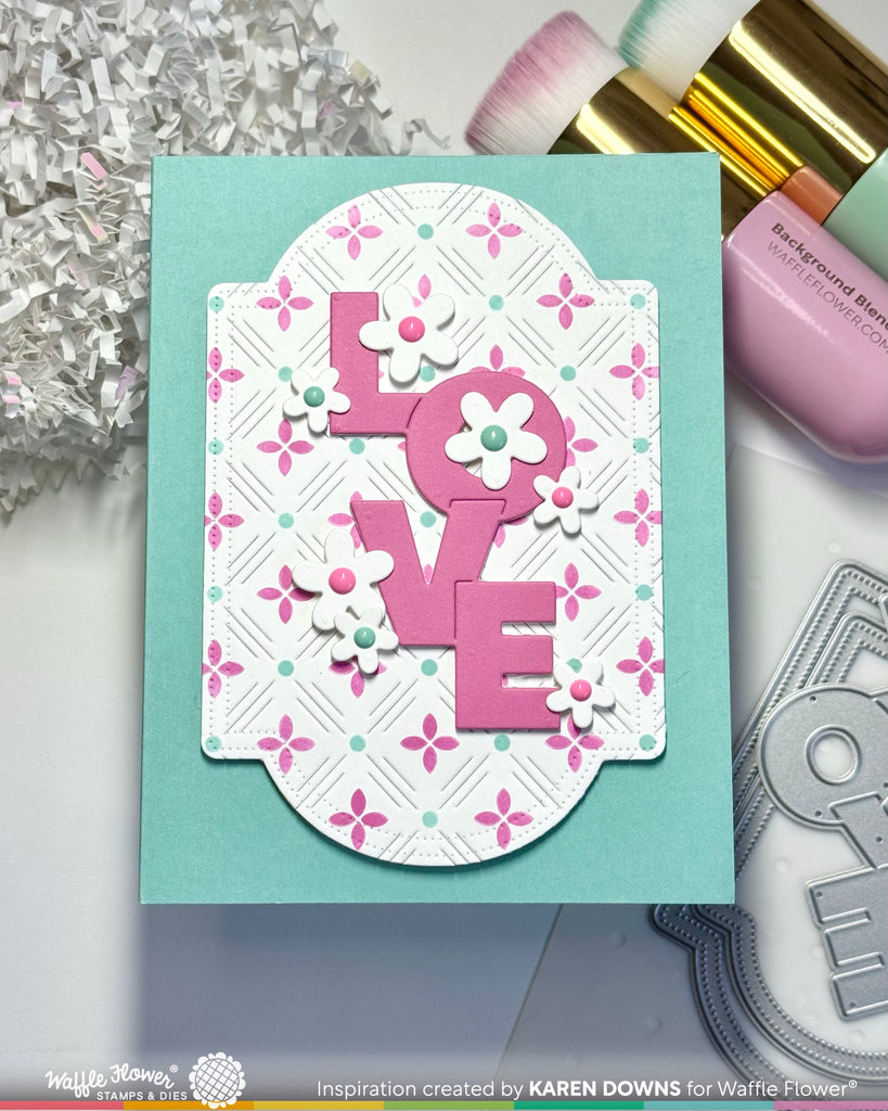 This die features the word “Love” arranged vertically with the letters slightly overlapping, so you can cut it out as one solid piece. Great for layering over a flower cluster or postage collage elements to be the focal point of your card.