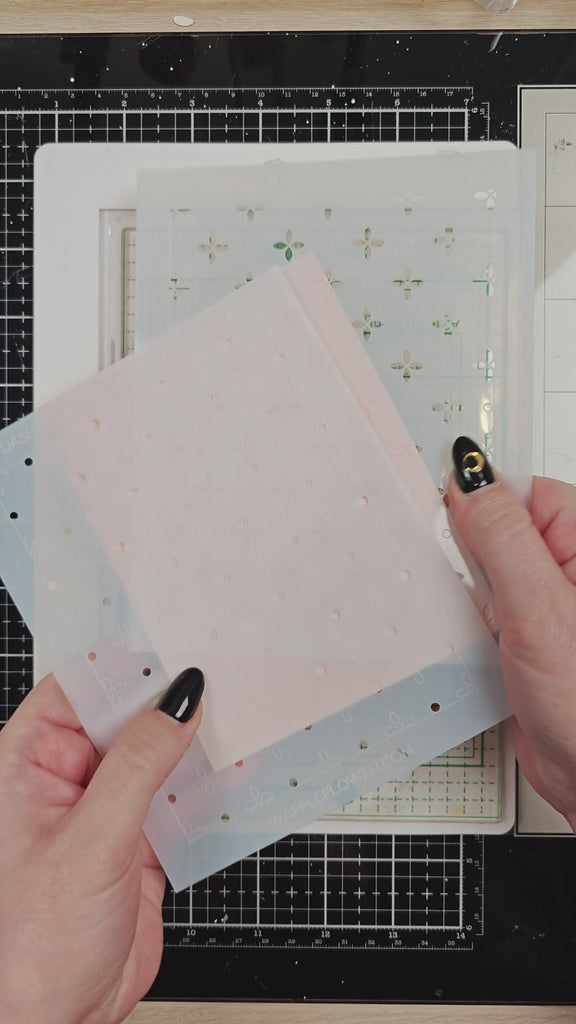 This stencil includes a dot pattern and a 4-leaf shape designed to align with the open spaces of the Dashed Lattice Texture Die. You can also use it on its own for a simple background.