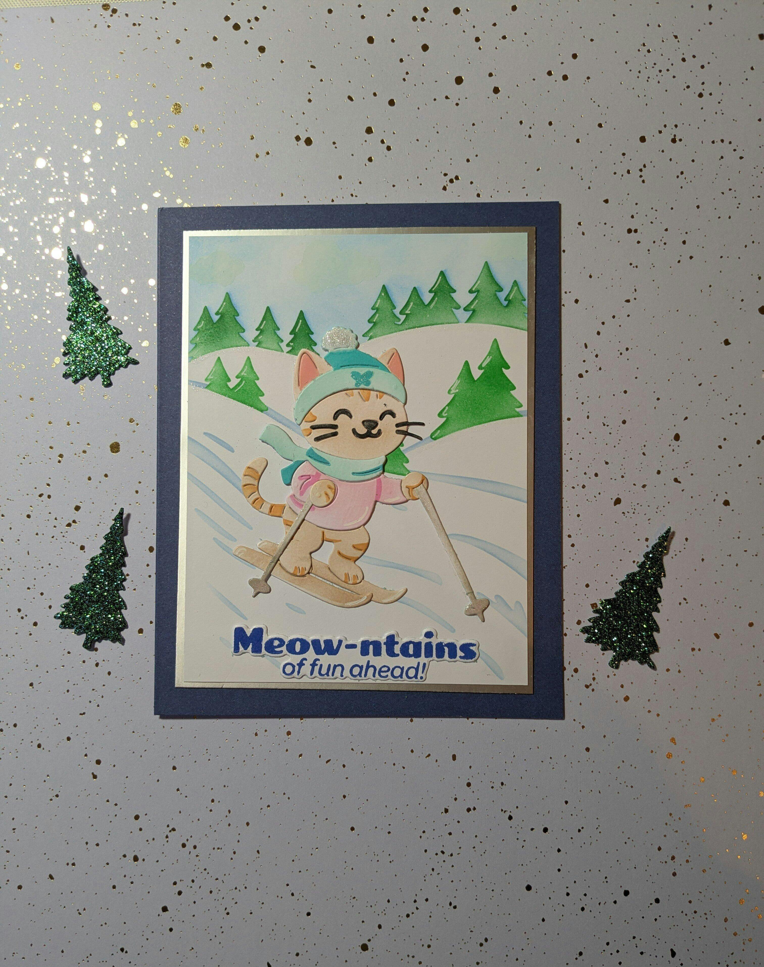 This set includes a cat with winter accessories and skis. Cut the pieces from cardstock and use the stencil to add shadows and details. The dies are numbered for easy assembly.