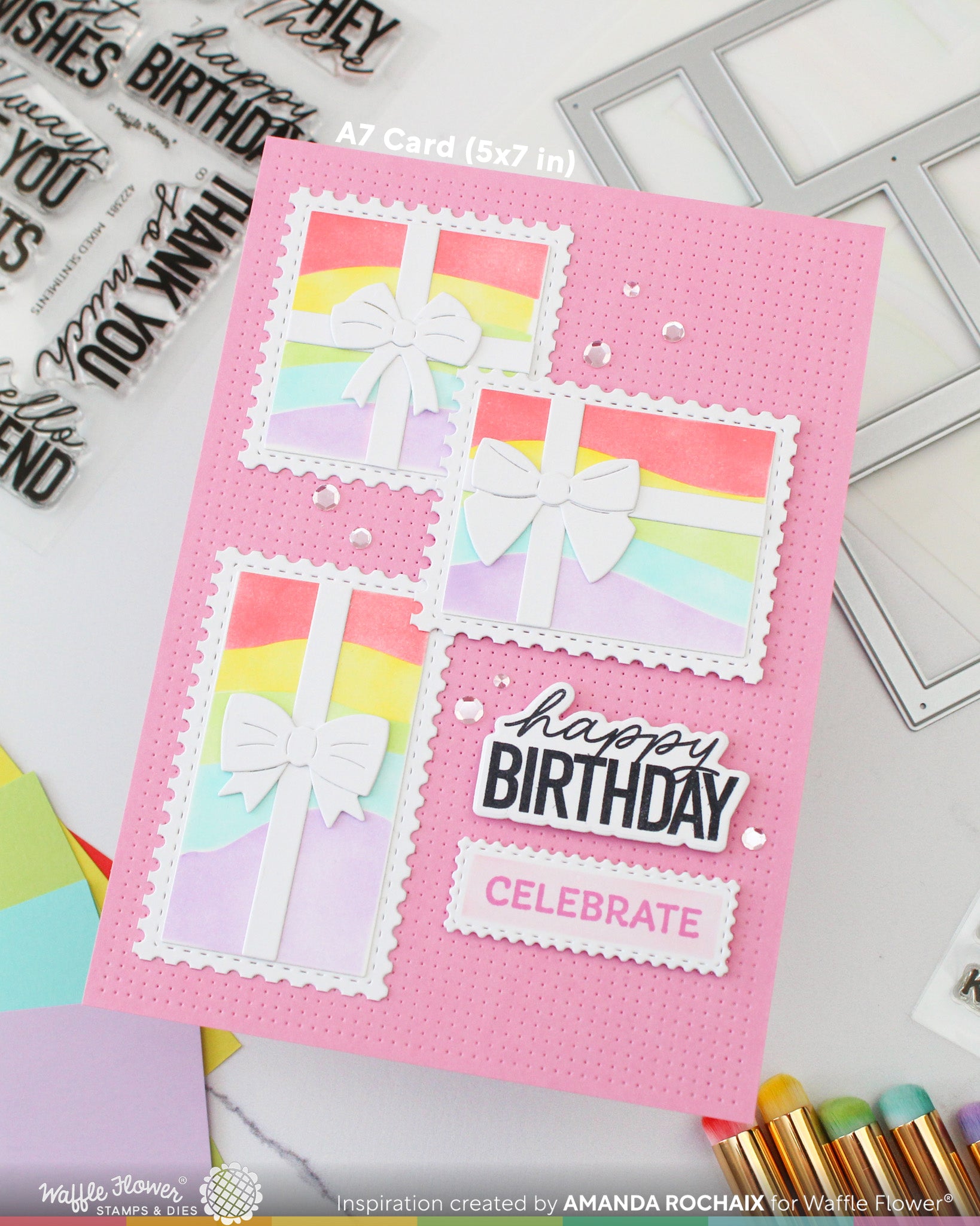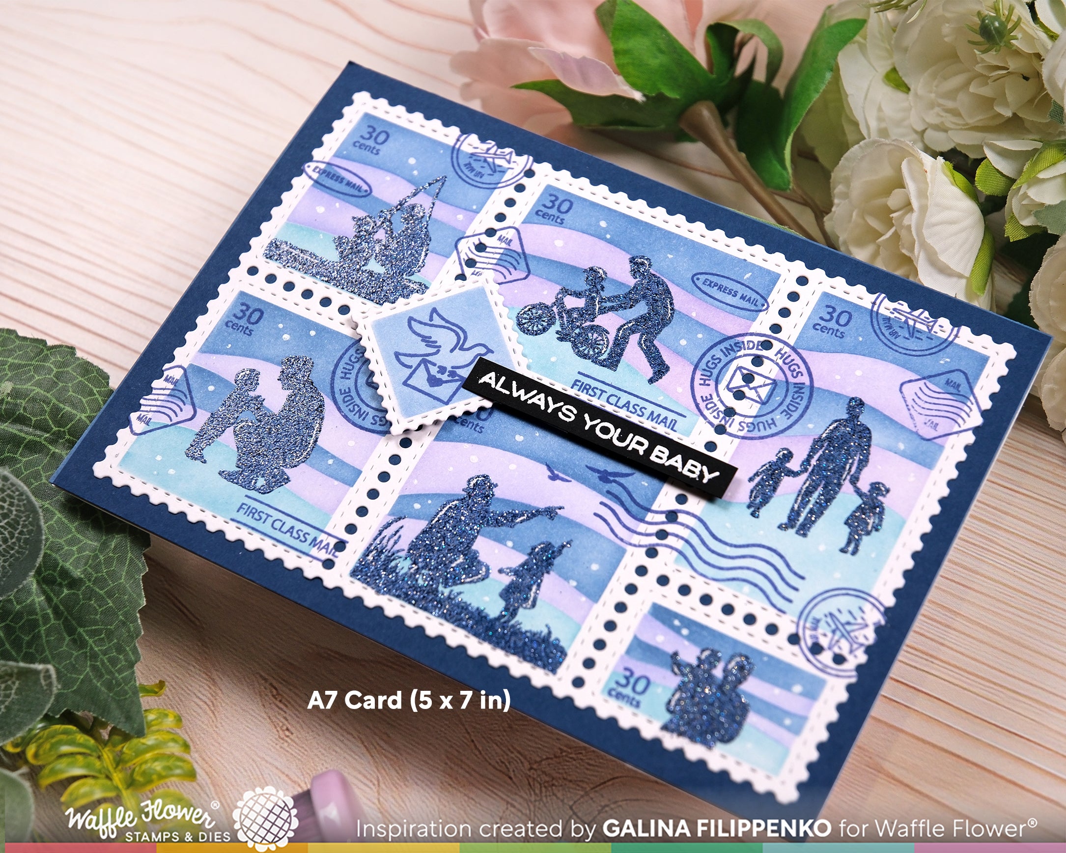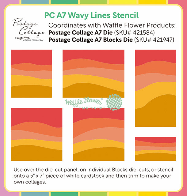 The Wavy Lines Stencil brings a fun, flowing background option to the Postage Collage A7 (die). It's great for adding movement to your cards and pair beautifully with silhouette stamps. Turn the designs into graphic backgrounds, skies, underwater scenes, or rolling hills. You can also customize the look by using just parts of the design.