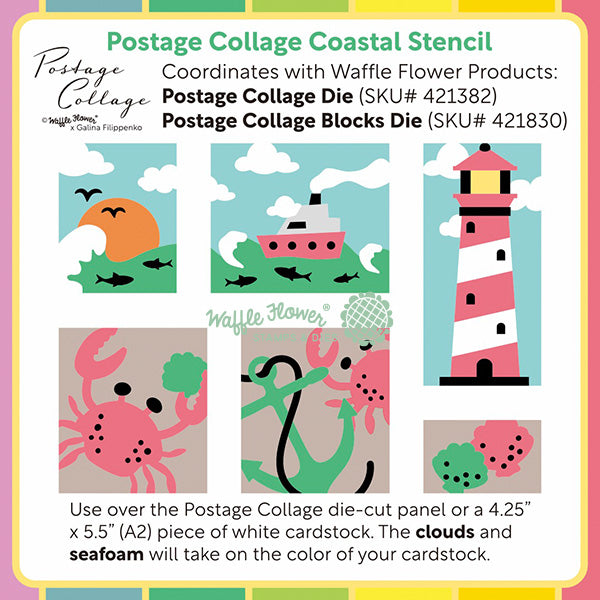 Like the rest of our Postage Collage™ themed stencil line, this Coastal stencil works with both the original Postage Collage Die and the Blocks Die. Use it with the panel die for a postage stamp look, or with the blocks die for a framed layout or shaker windows.