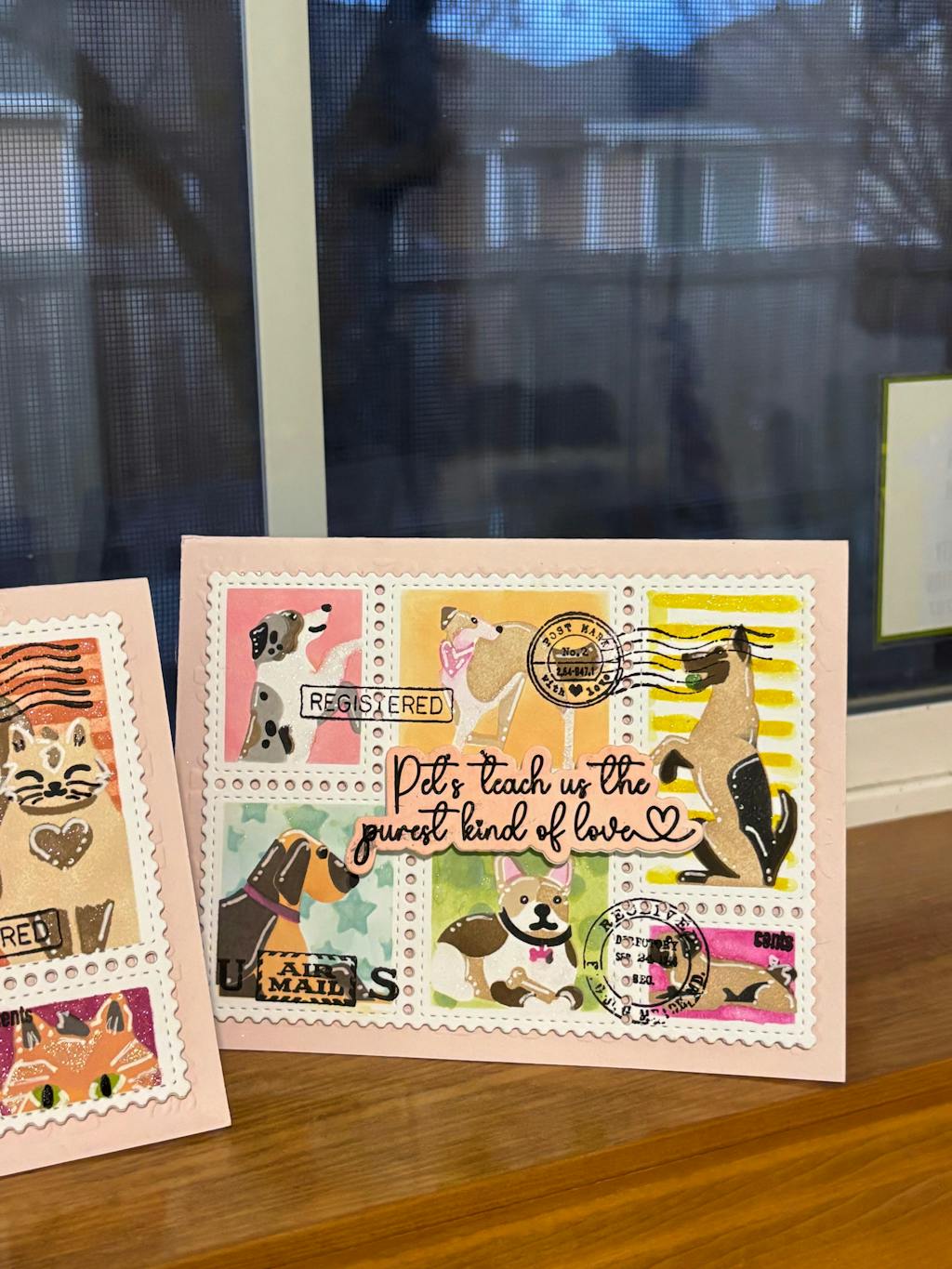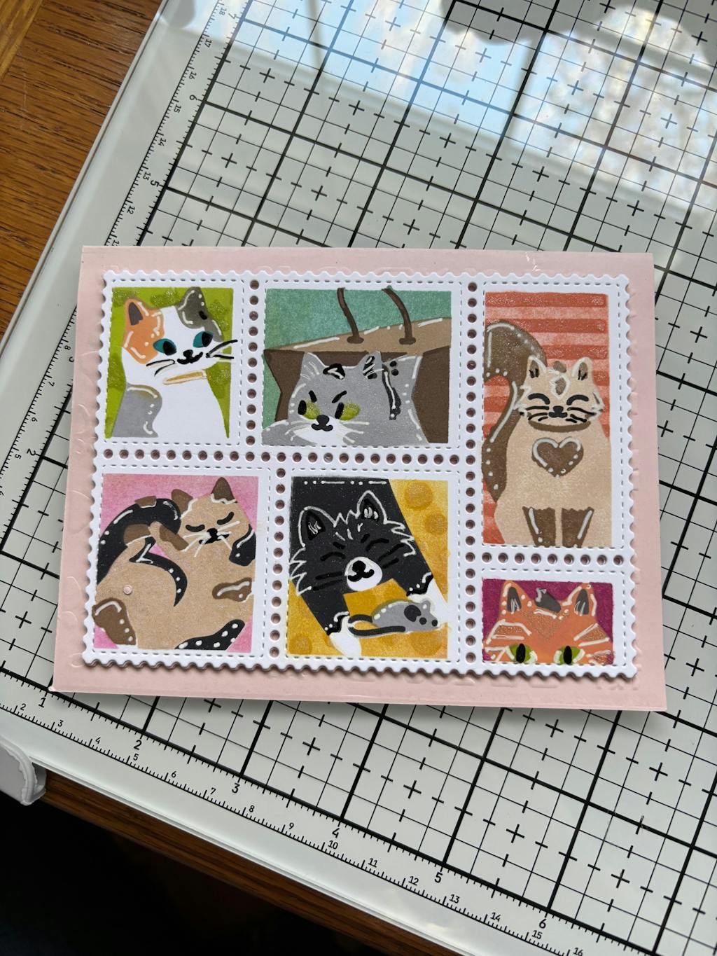 Add a playful feline flair to your cards with the Postage Collage Meow Stencil! Designed to coordinate with our Postage Collage Die (421382) and Postage Collage Blocks Die (421830), this stencil features a charming lineup of cats in cozy and quirky poses. Use it over a die-cut panel or a standard A2-sized piece of white cardstock. The white areas shown in the examples represent the base color of the cardstock.