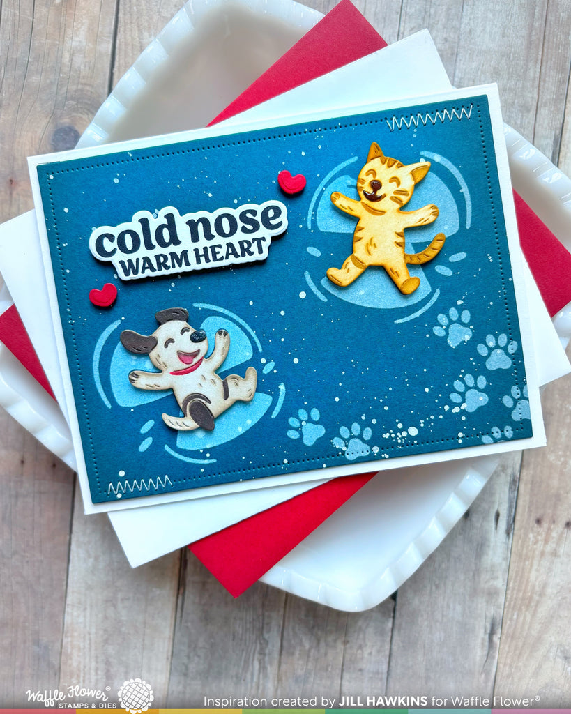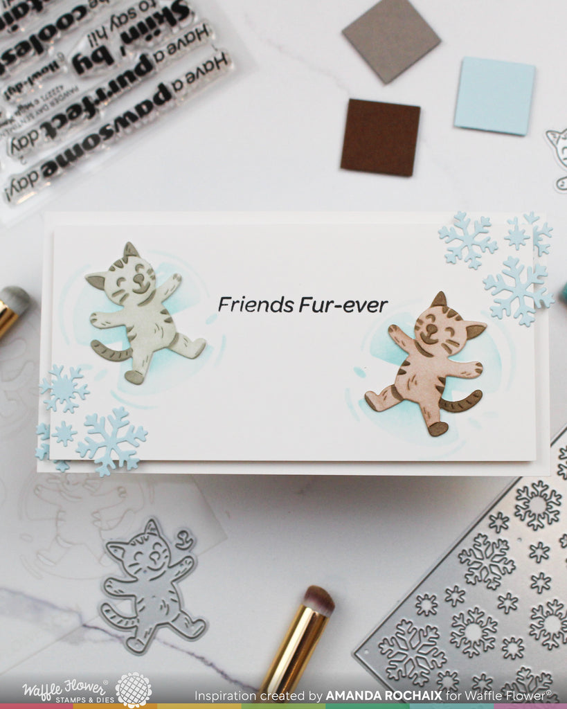 The Snow Angel Cat Duo Die-n-stencil includes two mirrored cats designed to be colored using the same stencil. Simply flip the stencil to color the cat in the other direction. These playful cats are great for winter cards and add a charming touch to snowy scenes.